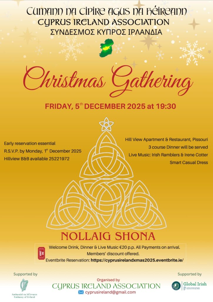 We are the Cyprus Ireland Association which aims to develop social and cultural relations between Cyprus and Ireland. By organising events we aim to promote Irish culture in Cyprus, fostering Celtic links with groups and individuals in Cyprus and creating Cypriot links with groups and individuals in Ireland.